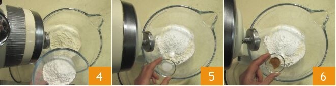 Una vez frías, transfiere las harinas tostadas al bol de una batidora de pie (o en un bol grande si trabajas a mano), luego añade el azúcar glas 4, la sal 5 y una pizca de canela en polvo 6;