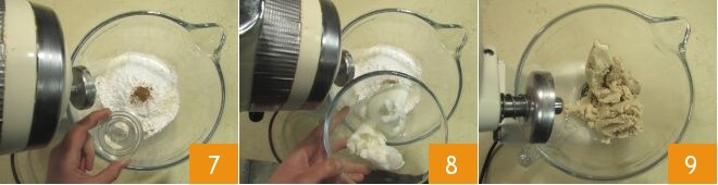 vierte también el licor de anís 7 y la manteca de cerdo fría (como se indica en el consejo, alternativamente puedes usar mantequilla) 8 y mezcla con el gancho de hoja hasta que los ingredientes estén bien integrados 9.