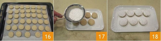 Una vez cocidas, las galletas aún estarán un poco blandas, tanto que al tocarlas con la punta del dedo se quedará pegada parte de la masa: no te preocupes, se solidificarán una vez frías 16. Después de dejarlas enfriar, espolvorea con abundante azúcar glas 17 y sirve los polvorones a tus invitados 18 o envuélvelos en papel de seda para ofrecerlos como regalo a tus amigos.