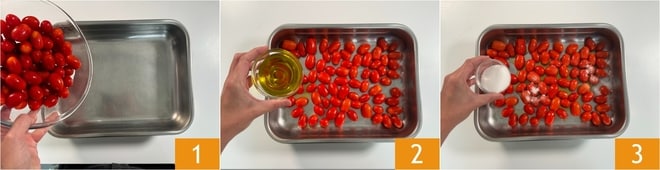 Para preparar los tomatitos confitados, primero lava con cuidado los tomatitos. Colócalos en una bandeja 1 y adereza con aceite de oliva 2 y azúcar 3.