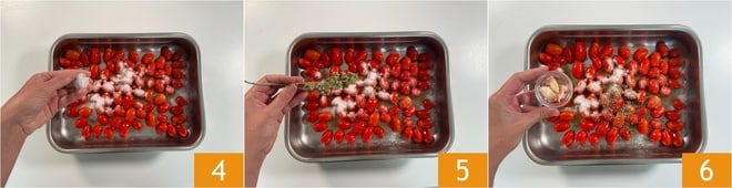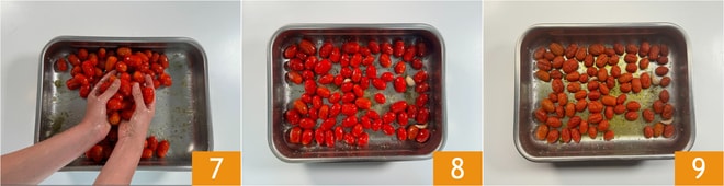 Masa los tomatitos con las manos 7 para aderezar de manera uniforme 8. Cocina en horno precalentado a 120° en modo estático durante 3 horas. Una vez listos 9, los tomates confitados se pueden disfrutar calientes o dejar enfriar y conservar en el frigorífico.