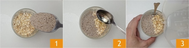 Para preparar el porridge frío, primero coloca en un tarro de vidrio los copos de avena y las semillas de chía 1, luego añade el jarabe de agave 2 y el agua a temperatura ambiente 3.