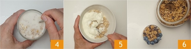 Mezcla bien 4, luego cierra con la tapa y deja reposar en el frigorífico toda la noche (o al menos 6 horas). Pasado el tiempo de reposo, transfiere el porridge a un bol y decora con el yogur de soja 5, la granola de chocolate y los arándanos 6. ¡Tu porridge frío está listo para disfrutar!