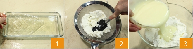 Para preparar el postre de leche, empieza poniendo la gelatina en agua fría durante unos 10 minutos para que se ablande 1. Tamiza la ricotta en un bol grande para evitar que se formen grumos en la mezcla 2 y añade la leche condensada 3.