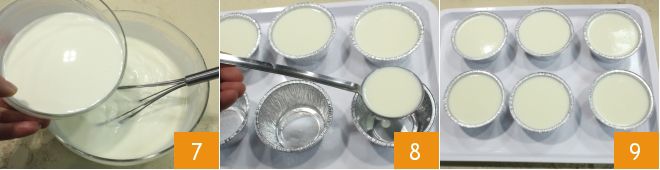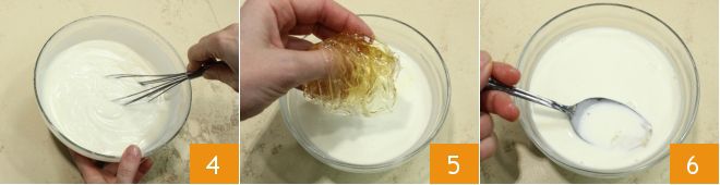 Mezcla bien la preparación con unas varillas 4. Escurre bien la gelatina que habías hidratado y disuélvela en la nata tibia 5, remueve con una cuchara hasta que esté completamente disuelta 6.
