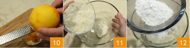 Mientras tanto, ocúpate de la galleta que acompañará al postre de leche: ralla la piel de una naranja 10 y resérvala. En un bol añade las almendras picadas 11 y incorpora el azúcar glas tamizado 12,