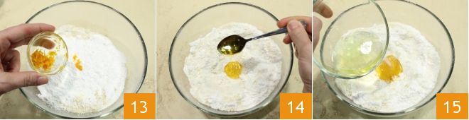 aromatiza con la ralladura de naranja 13 y una cucharadita de miel 14; por último añade una clara de huevo 15 y una pizca de sal.