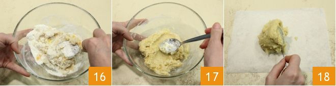 En este punto mezcla la preparación con una cuchara 16 hasta obtener una masa compacta y bien integrada 17. Coloca sobre la superficie de trabajo un papel de horno, transfiere la masa con una cuchara sobre el papel 18