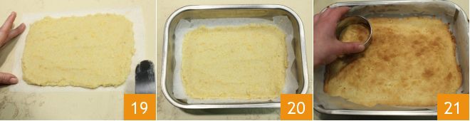 y extiéndela dándole una forma rectangular de aproximadamente 18 x 25 cm 19. Traslada la base de galleta a una bandeja rectangular ligeramente más grande 20 y hornea en horno convencional precalentado a 180 °C durante 15 minutos (o en horno con ventilación a 160 °C durante unos 10 minutos). Cuando la superficie de la galleta esté dorada, sácalo del horno y deja que se enfríe. Una vez fría, corta discos de galleta con un cortapastas redondo de 8 cm de diámetro 21.