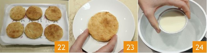 Obtendrás 6 discos de galleta 22. Ahora puedes montar tu postre: coloca en un plato de postre un disco de galleta 23, desmolda el postre de leche; para facilitar esta operación sumérgelo unos instantes en un cuenco con agua caliente 24,