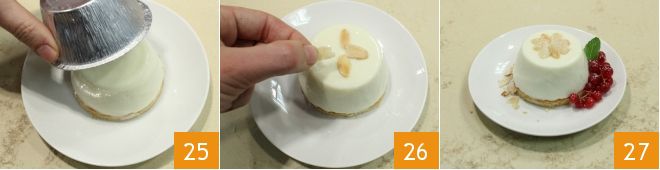 después inviértelo y colócalo sobre la galleta 25. Tu delicioso postre de leche está listo; antes de servirlo, decóralo al gusto con láminas de almendra 26 y grosellas 27.