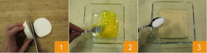 Para preparar el primosale frito, lo primero es cortarlo en rodajas 1. Dependiendo del tamaño del primosale que tengas, puedes elegir si sacar rodajas o cubitos. Rompe los huevos en un cuenco y bátelos 2, luego vierte el pan rallado en otro cuenco y condiméntalo con una pizca de sal 3. Finalmente pon la harina en un tercer cuenco. Coloca una cazuela con aceite al fuego y caliéntalo hasta que alcance una temperatura de 165°.