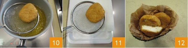 Cocina durante unos 4 minutos y cuando esté bien dorado, escurre el primosale frito 10 y colócalo en una bandeja forrada con papel absorbente 11. Ajusta el tiempo de cocción según el tamaño del primosale; nuestros trozos pesaban alrededor de 160 g. Fríe también las rodajas restantes y sirve 12.