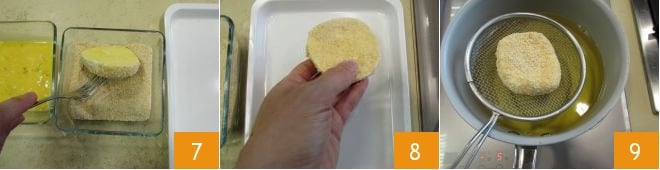 Por último, pásalo por el pan rallado 7 asegurándote de que esté bien cubierto por todos los lados. En este punto, colócalo en una bandeja 8 y continúa con las otras rodajas. Tan pronto como el aceite esté a temperatura, sumerge pocos trozos a la vez 9, para no bajar demasiado la temperatura.