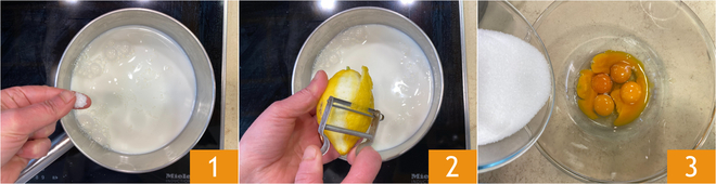Para preparar los profiteroles de limón, empezad por la crema: verted la leche en un cazo, sazonad con una pizca de sal 1 y la ralladura de limón 2, y llevad a ebullición. En un bol aparte unid las yemas y el azúcar 3 y mezclad con un batidor manual, sin incorporar aire.