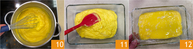 Llevad a ebullición a fuego medio-bajo removiendo continuamente, hasta obtener una textura espesa y sin grumos 10. Pasad la crema a un recipiente bajo y ancho 11, cubrid con film transparente en contacto con la superficie 12 y dejad templar a temperatura ambiente. Refrigerad para que cuaje al menos 3 horas.