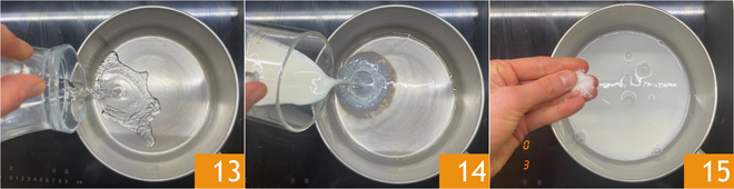 Mientras tanto, ocupáos de la masa choux: en un cazo de fondo grueso verted el agua 13, la leche 14 y una pizca de sal 15.