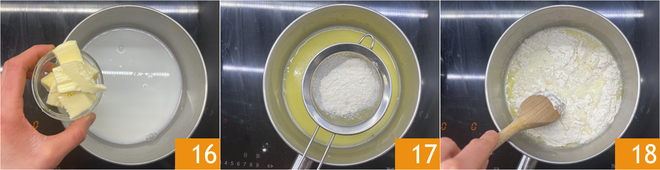 Añadid también la mantequilla 16 y dejad que se derrita a fuego bajo. Cuando la mantequilla esté derretida, incorporad la harina tamizada 17 y mezclad enérgicamente con una cuchara de madera 18.