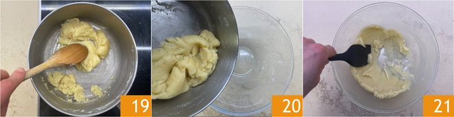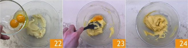 Incorporad un huevo por vez 22 y mezclad bien para que se absorba completamente 23. Cuando obtengáis una masa homogénea 24, pasadla a una manga pastelera con boquilla lisa de 12 mm.