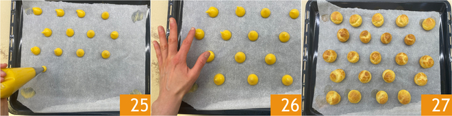 Forrad una bandeja con papel de horno y expulsad la masa formando pequeños montoncitos de 3 cm de diámetro 25. Humedeced la punta de un dedo con agua y aplastad suavemente la punta de los montoncitos; así conseguiréis una forma redondeada 26. Hornead en horno estático precalentado a 200° durante unos 20-22 minutos. Pasado el tiempo de cocción, sacadlos del horno y dejadlos enfriar completamente 27.