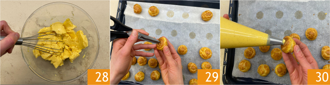 Transcurrido el tiempo de enfriado de la crema, batidla con un batidor para ablandarla 28 y pasadla a una manga pastelera, también con boquilla lisa de 12 mm. Con la punta de unas tijeras, practicad un orificio en la base de cada bignè 29. Introducid la boquilla en el orificio y rellenad generosamente los bignè con la crema 30. La crema pastelera que sobre se utilizará para la cobertura.