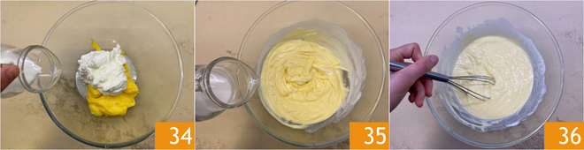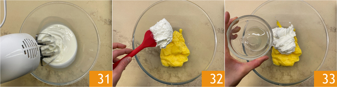Pasad a la glasa: montad 150 g de nata con las varillas eléctricas 31. En un bol, unid la nata montada a la crema de limón sobrante 32, y luego añadid el limoncello 33.