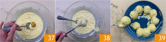Sumergid pocos bignè a la vez en la glasa 37 y escurridlos con un tenedor para que caiga el exceso 38. Colocad los bignè glaseados poco a poco en la fuente formando la clásica pirámide 39.