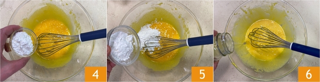 Incorporad el almidón de maíz 4 y el almidón de arroz 5. Cuando las harinas estén absorbidas, añadid el zumo de limón 6 y mezclad de nuevo.