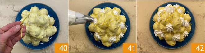 Después de haber glaseado todos los bignè, montad 100 g de nata para la decoración con el azúcar glas. Adornad la pirámide de bignè con tiras finas de piel de limón 40 y rellenad los huecos con pequeños rosetones de nata montada, usando una manga pastelera con boquilla de estrella 41. Refrigerad para que cuaje al menos 2-3 horas. ¡Vuestros profiteroles de limón estarán listos para servir 42!
