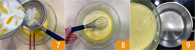 En este momento, verted la leche caliente en el bol colándola a través de un colador 7 y mezclad todo con un batidor 8. Pasad la mezcla a un cazo de fondo grueso (no utilicéis el mismo en el que calentasteis la leche, porque la crema podría pegarse) 9.