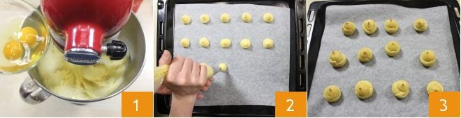 Para preparar los profiteroles salados, comienza haciendo la pasta choux: pon una cacerola al fuego, añade la mantequilla, el agua, el azúcar y una pizca de sal, mezcla todo con un batidor. Una vez que alcance el hervor, retira la cacerola del fuego y añade la harina tamizada. Continúa la cocción, volteando la mezcla con una cuchara de madera y cuando la mezcla se despegue completamente de la cacerola, retira del fuego y deja enfriar en un plato. Una vez frío, coloca la mezcla en una batidora de pie con gancho de hoja (alternativamente, puedes hacer esta operación también con una cuchara de madera en un bol, mezclando enérgicamente), y añade los huevos uno a uno, asegurándote de añadir el siguiente solo cuando el anterior se haya absorbido completamente por la masa 1. Al final, deberás obtener una mezcla lisa y homogénea, transfiérela a una manga pastelera con boquilla lisa y forma montoncitos de masa separados entre sí, en una bandeja cubierta con papel de horno 2. Hornea en horno estático precalentado a 170°-175° durante 30-35 minutos (si es horno ventilado, 150°-155° durante 25-30 minutos). Una vez transcurrido el tiempo de cocción, deja los petit-choux en el horno abierto para secar: deberán quedar ligeros y crujientes 3. Para descubrir cómo preparar y conservar mejor los petit-choux consulta la receta: Pasta choux (profiteroles).