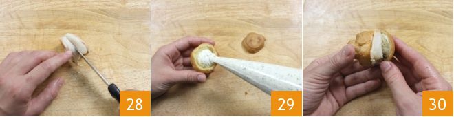 Continúa con el relleno de los petit-choux con las gambas: una vez enfriadas, divide las gambas por la mitad 28, luego rellena los petit-choux con la crema de queso de cabra 29 y con media gamba 30, unta un poco de crema en la tapa y sella el petit-choux.