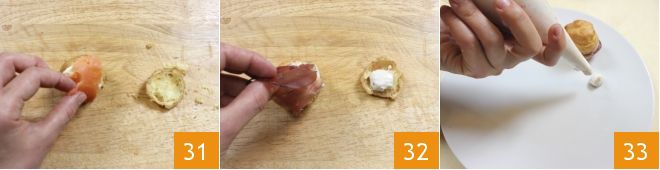 Continúa rellenando los petit-choux restantes con la crema de queso de cabra y una loncha de salmón 31 y con la crema de jamón cocido y una loncha de bresaola 32. Recuerda reservar una o dos lonchas de salmón y bresaola, que te servirán para realizar la decoración del plato. Para presentar este plato de manera simpática y efectiva, puedes disponer los petit-choux rellenos en forma de pirámide. Primero exprime una gota de crema al gusto en un plato de presentación bastante amplio 33.