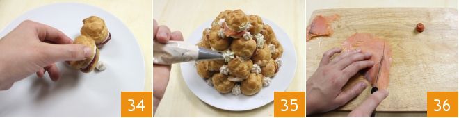 Luego coloca el petit-choux relleno sobre la gota de crema 34, de manera que quede bien estable y continúa así con los demás petit-choux que formarán la base. Por ejemplo, puedes formar la primera capa de la pirámide con los petit-choux de salami y luego seguir con los de otros sabores. Una vez concluida la pirámide, decora los espacios entre un petit-choux y otro con unos ramitos de crema, quizás alternando la de jamón cocido y la de queso de cabra 35, luego toma las lonchas de salmón que has reservado y córtalas en tiras 36.