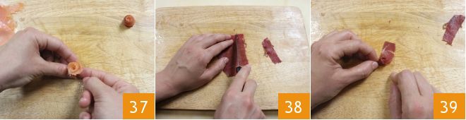 Enrolla las tiras, formando unas florecillas y reserva 37. Realiza la misma operación con las lonchas de bresaola: córtalas en tiras 38 y enróllalas, creando unas florecillas 39.