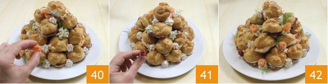 Coloca a tu gusto las florecillas de salmón y de bresaola en la pirámide (40-41) y si deseas, adorna también con algunos ramitos de eneldo fresco 42. ¡Solo te queda servir tus profiteroles salados y disfrutarlos todos!