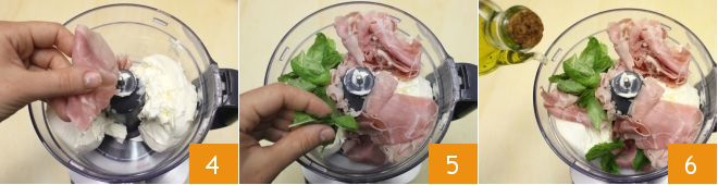 Mientras tanto, prepara las cremas con las que rellenarás los petit-choux, comienza con la de jamón: coloca el queso fresco para untar y las lonchas de jamón cocido en una batidora 4, añade también las hojas de albahaca y menta 5 y condimenta con un chorrito de aceite 6.