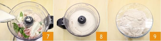 Añade la leche en hilo 7, sala y pimenta al gusto y bate hasta obtener una crema densa y homogénea 8. Transfiere la crema a un bol, cubre con film transparente y consérvala en la nevera hasta el momento de usarla 9.