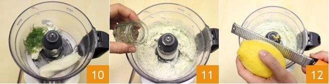 Ahora dedícate a la crema de queso de cabra: vierte el eneldo fresco y el queso de cabra en el vaso de una batidora 10 y bate hasta obtener una crema densa y homogénea. Luego sala y pimenta al gusto 11, añade un chorrito de aceite y luego ralla media cáscara de un limón 12.