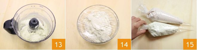 Bate nuevamente para mezclar todo 13 y luego transfiere la crema de queso de cabra a un bol, cúbrela con film y deja reposar en la nevera hasta el momento de usarla 14. También puedes transferir ambas cremas directamente a las mangas pasteleras y dejarlas enfriar en el frigorífico 15.