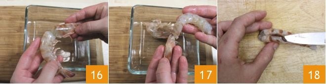 En este punto, continúa con la limpieza de las gambas, con las que condimentarás parte de los petit-choux. Si usas gambas frescas, enjuágalas cuidadosamente bajo agua corriente, luego elimina las cabezas, haciendo presión y tirando con los dedos 16. Luego, desprende también las patas y retira el caparazón y las colas 17. Luego, coloca la pulpa sobre una tabla de cortar, haz una pequeña incisión en la espalda con un cuchillo y elimina el intestino interno 18. Para realizar esta operación de la mejor manera, consulta nuestra Escuela de cocina: Cómo limpiar los gambones.