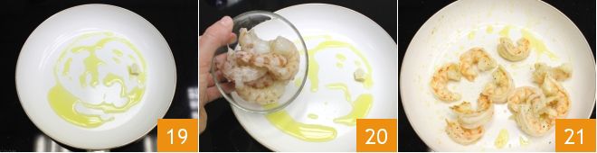 Toma una sartén antiadherente, calienta un chorrito de aceite y deja dorar un diente de ajo pelado 19. Vierte las gambas peladas 20 y saltéalas a fuego medio durante unos 5 minutos, hasta que estén bien rosadas 21. Una vez cocidas, déjalas enfriar.
