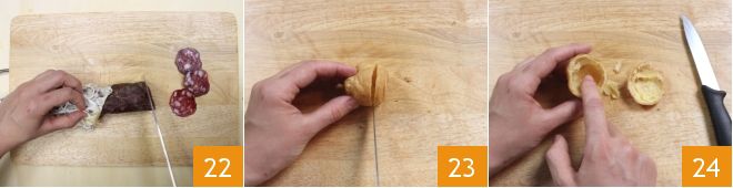 Ahora dedícate al relleno de los petit-choux, que ya se habrán enfriado. Coloca el salami en una tabla de cortar y córtalo en lonchas bastante finas 22, luego toma los petit-choux y divídelos por la mitad con un cuchillo 23, luego elimina con los dedos cualquier residuo de masa en el interior para dejar espacio al relleno 24.