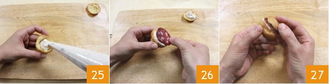 Saca del refrigerador las mangas pasteleras con las cremas: exprime la crema de jamón en los petit-choux que servirás con el salami 25, luego coloca una rebanada de salami 26 y después de haber untado un poco de crema también en la tapa, cierra el petit-choux 27.