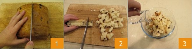 Para preparar el pudding de panettone, comenzad cortando el panettone 1 en cubos de aproximadamente un par de centímetros 2, luego rociadlos con ron blanco 3,