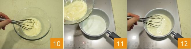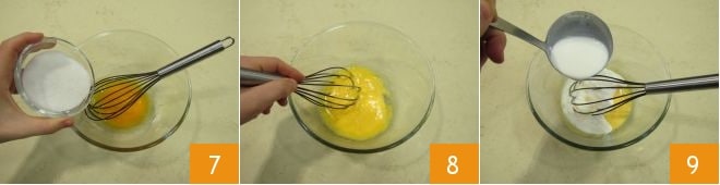 En un recipiente unid el azúcar con las yemas 7 y batid durante unos instantes con una batidora de varillas hasta obtener una mezcla homogénea 8, luego verted la leche ya templada para diluir (si preferís, podéis ayudaros con un cucharón para no ensuciar la superficie de trabajo) 9.