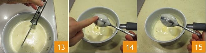 Para estar realmente seguros sobre la cocción, utilizad un termómetro de cocina, cuando alcance los 85° la crema estará lista, más allá de esa temperatura se corre el riesgo de que los huevos y la leche se separen comprometiendo así el resultado 13. También podéis hacer la prueba de la cuchara: esto significa asegurarse de que la crema cubra la cuchara. Para hacerlo bastará con pasar el dedo por el dorso de la cuchara 14, las partes deben permanecer separadas, por lo que la parte superior no goteará hacia la inferior 15.