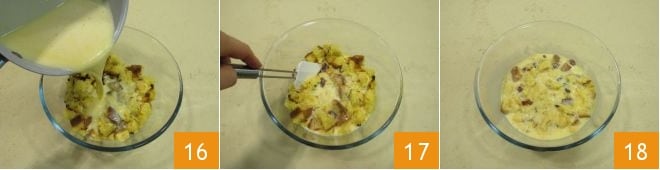 Después de dejar templar durante unos minutos la crema inglesa, vertedla sobre los cubos de panettone 16 y mezclad con una espátula 17 para obtener una mezcla homogénea 18.