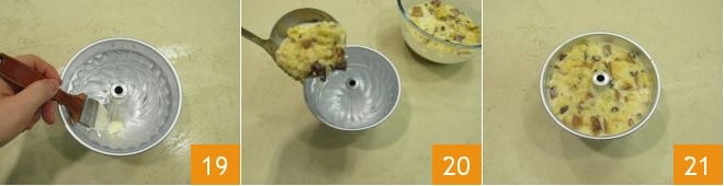 Untad con mantequilla un molde para pudding con capacidad de 500 ml 19 y verted la crema con el panettone, si lo preferís ayudándoos con un cucharón 20. Finalmente, podéis cocer vuestro pudding de panettone 21 en horno precalentado a 160° en modo estático durante 50 minutos.