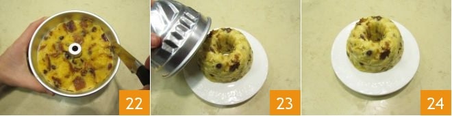 Cuando el dulce esté listo, sacadlo del horno y dejadlo enfriar completamente, a temperatura ambiente, antes de despegarlo del molde 22 y colocarlo en el plato de servir 23. Ahora solo os queda dedicaros a la decoración 24.